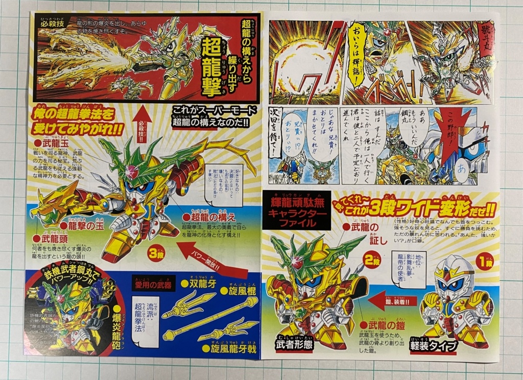 武者形態に加え、スーパーモード「超龍の構え」への変形ギミックも搭載。説明書は全8ページで、コミックワールドや連動ギミックも収録されています。