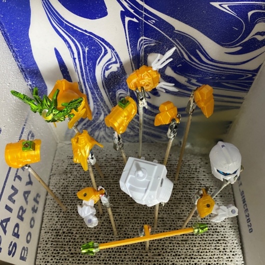 金塗装はラーミアンメディウムで薄め、筆先で叩くように塗ることでムラを防ぎました。塗装はすべて筆塗りで、作業時間は各パート約50分程度です。