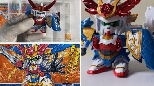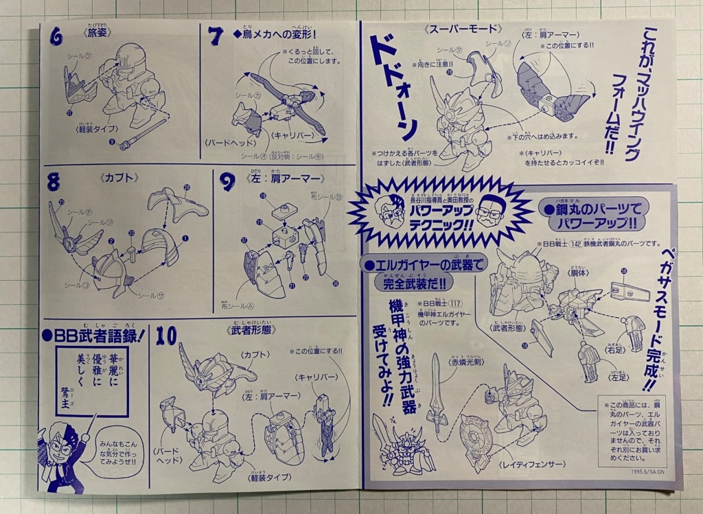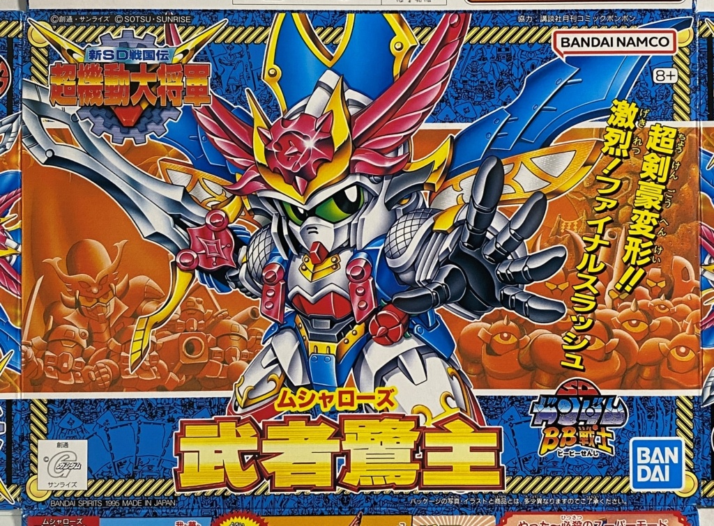 1995年発売のSDガンダムBB戦士No.145「武者鷺主」を素組みから筆塗り塗装まで制作。軽装・武者・マッハウィングフォームの三形態を、水性アクリル塗料で仕上げた工程を記録します。