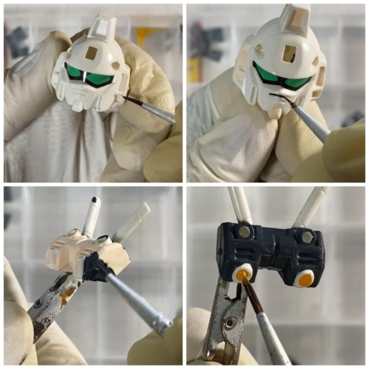 ダークグレイは腕部やバックパックに。ラーミアンメディウムを併用し、筆ムラを抑えながら丁寧に塗り重ねています。