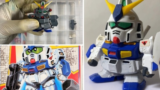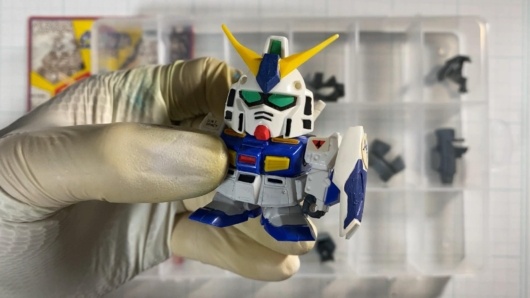 1989年発売のBB戦士キット「ガンダムNT-1」を、水性アクリル塗料で丁寧にリペイントしました。標準形態からチョバムアーマー装着形態まで、筆塗りによる色分け工程をわかりやすく紹介します。