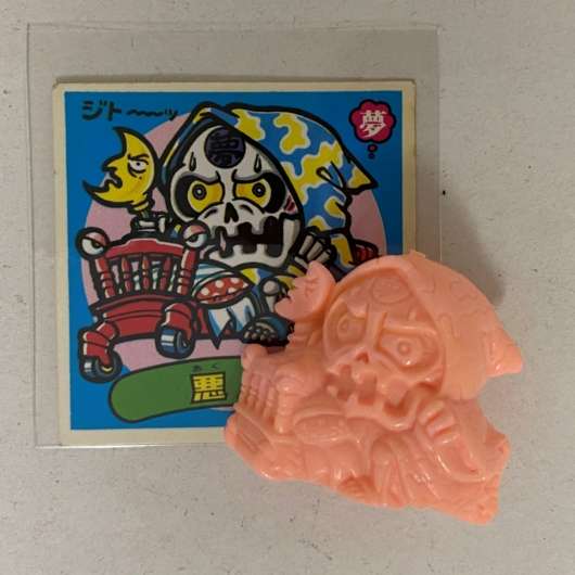 今回は「魔の弐・サタンマリアパワーアップ編」に登場する悪六(あくむ)を塗装しました。天魔界に属するキャラクターで、第5弾悪魔シールとして登場した人気キャラです。今回使用した消しゴムは、1988年に発売されたセット版の一つで、当時物シールとともに楽しめる貴重なアイテムです。