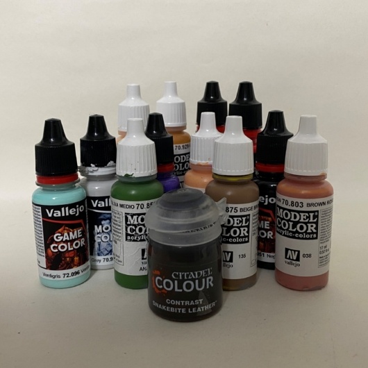 塗装は水性アクリル塗料を中心にオール筆塗りで行いました。基本はファレホを使用し、ポイントでシタデルカラーを併用しています。