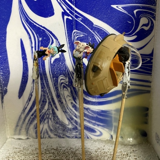 悟空の胴着はゲームカラーのエイリアンパープル。ブルマの瞳と髪にはベルデグリを使用し、鮮やかな発色を再現しました。