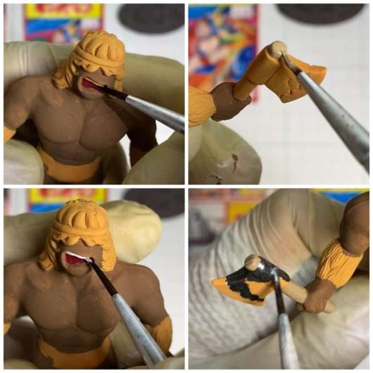 口内はスカーレットレッド、歯にはホワイトグレーを入れてアクセントに。トマホークの柄にはカーキ、刃にはガンメタルやグレイナイトスティールを使い、質感の違いを表現しました。