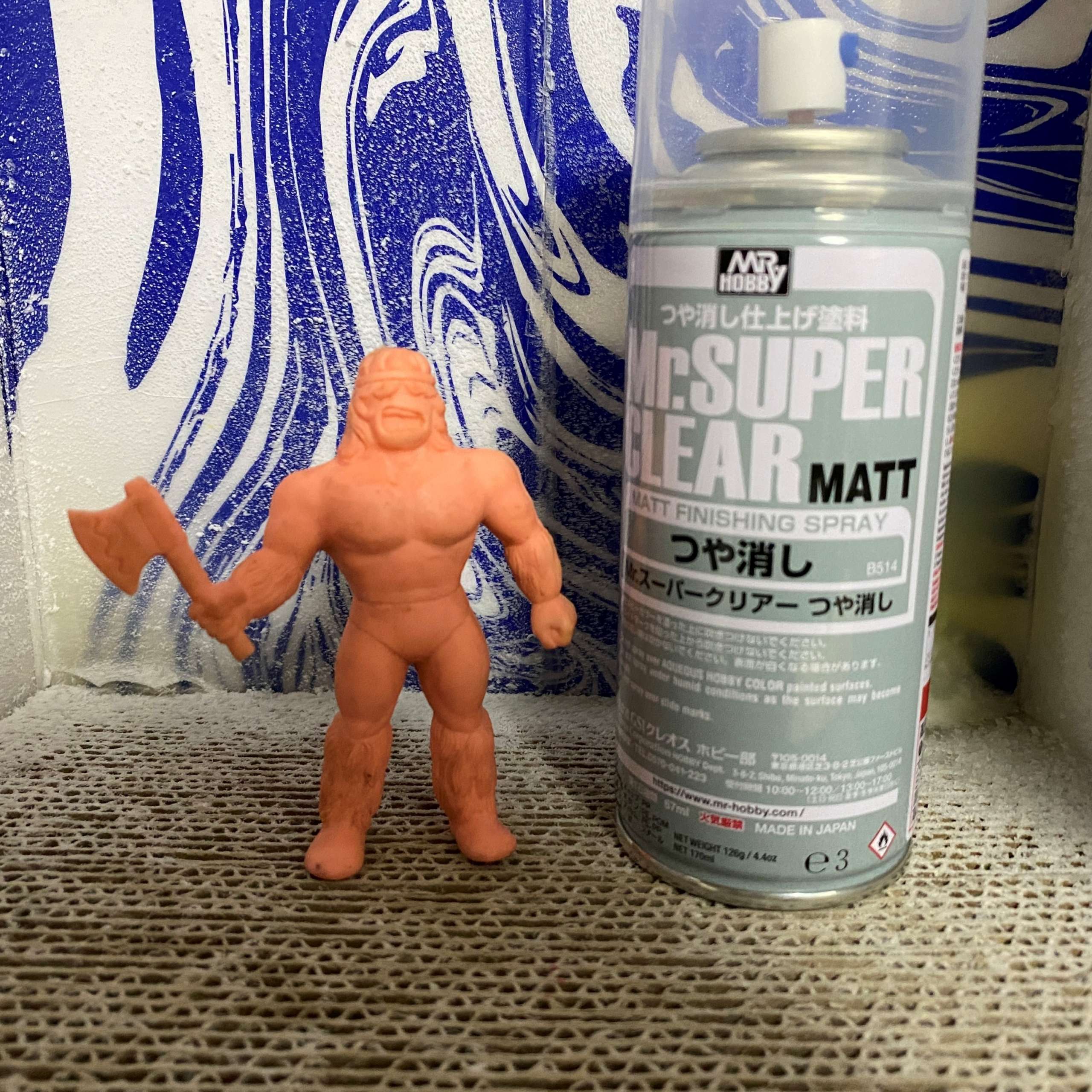 デカ消しの塗装では、煮沸による形状調整と洗浄、さらにベンジン漬けによる可塑剤抜きが重要です。乾燥後にはつや消しクリアを吹き、塗料の食いつきを良くする下地を作りました。