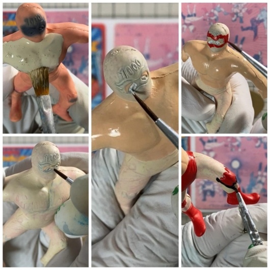今回は昭和当時に販売された丸越製「デカ消し・ワザ消し ファイティングポーズシリーズ」から、スカイマンとジェロニモのコブラツイストセットを原作カラーで塗装しました。使用したのは水性アクリル塗料(ファレホ&シタデルカラー)、すべて筆塗りで仕上げています。