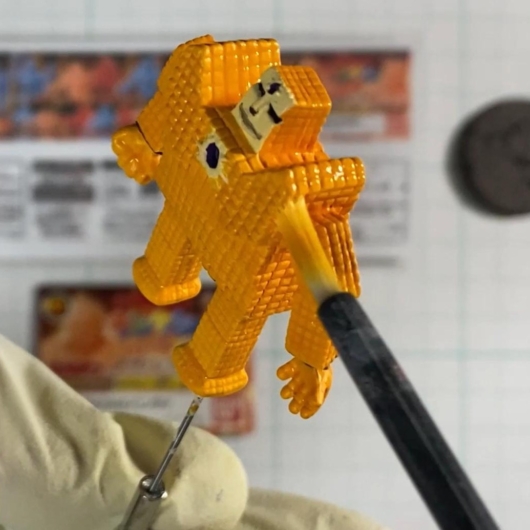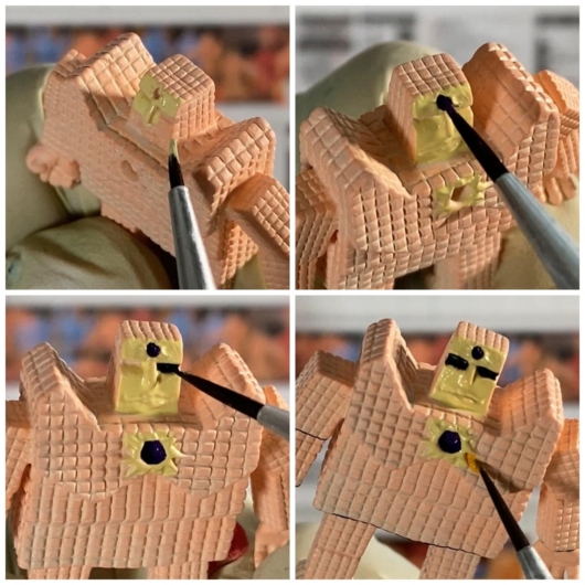 全体の黄色はゲームカラーの「ゴールドイエロー」。隠ぺい力が高く、ラーミアンメディウムで薄めながら重ね塗りすることでムラを防いでいます。