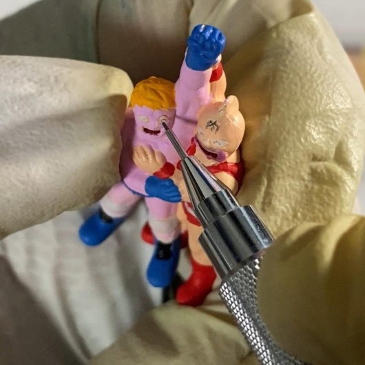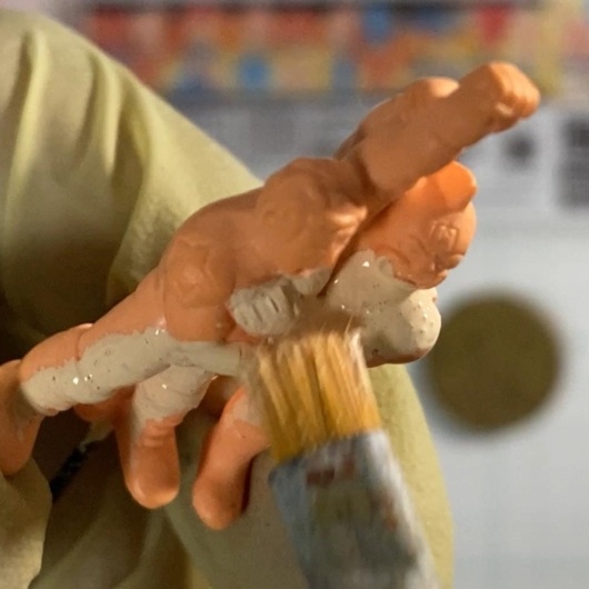 このキンケシは、キン肉マンとテリーマンの2超人が一体化した造形ですが、サイズはかなり小さめ。フリーハンド筆塗りでは限界に近いサイズ感ですが、細部まで丁寧に塗装していきます。