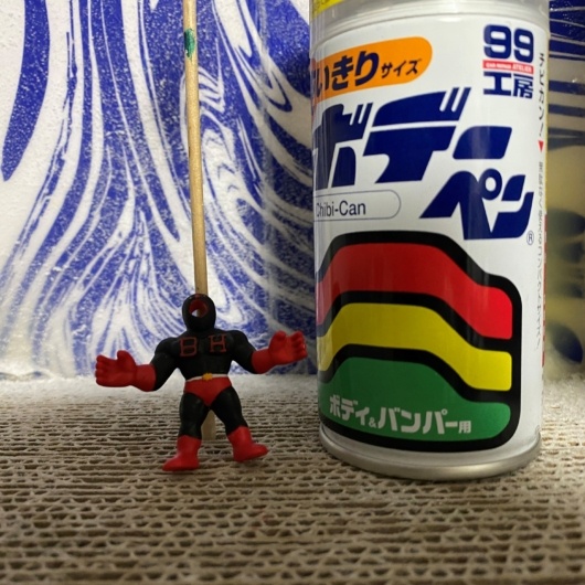 仕上げにソフト99コーポレーションのボデーペン・クリアを吹き付けて保護。台座にセットして完成です。赤と黒のコントラストが映える、シンプルながら存在感のある仕上がりになりました。