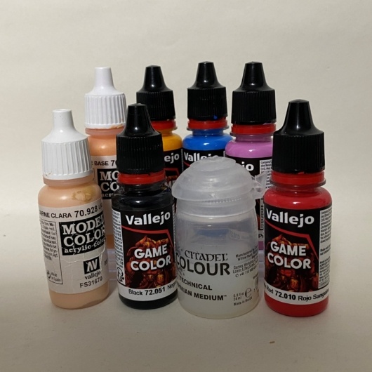 主に使用したのはスペイン発祥の模型用塗料「ファレホ」と、発色の良さが特徴の「シタデルカラー」。面相筆を基本に、広い面は平筆で効率よく進めています。