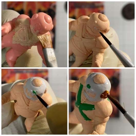 塗装は下地塗りと上塗りの2段階で進めます。まず全体にファレホの肌色ハイライトを塗り、発色を良くするベースを作成。この工程で仕上がりが大きく変わるため、丁寧に行うのがポイントです。