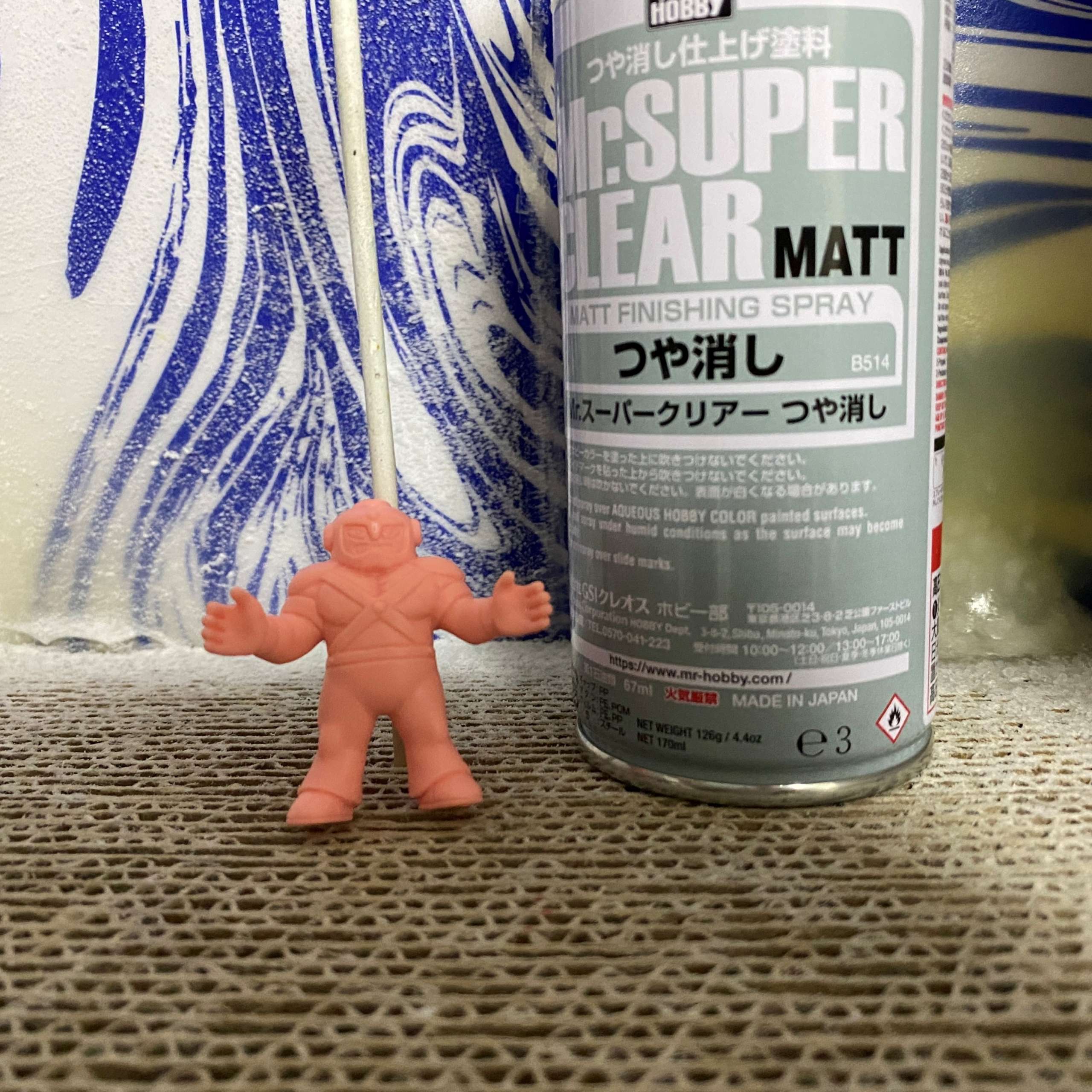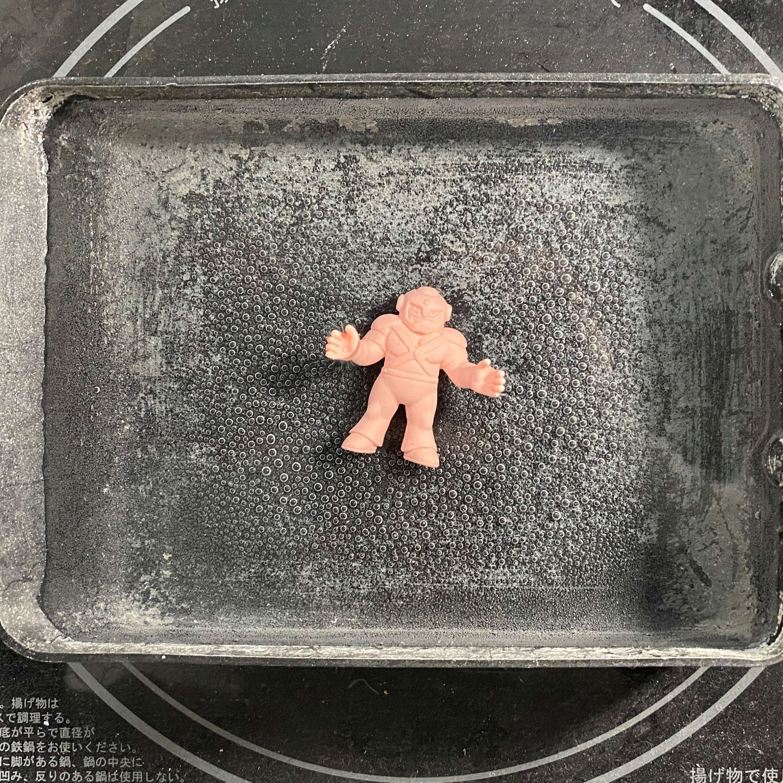 下処理は、煮沸による形状調整と油分除去、さらにベンジンに一晩ほど漬けて可塑剤を抜きます。その後しっかり乾燥させ、つや消しクリアを吹いて塗装の下地を作りました。