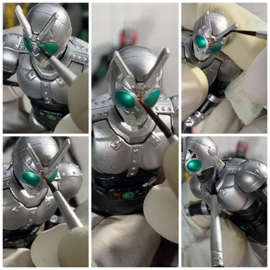 • シルバーの強調: 極細筆を使用し、ゲームカラーのブラックを使い、フェイスや脚部のシルバー箇所に細かく色分けを施します。