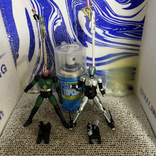 1. つや消し下地処理: まず、RX・シャドームーンともにMr.スーパークリアつや消しを吹き付け、フィギュア全体をマットな質感に整え、塗料の食いつきを良くする下地を作ります。