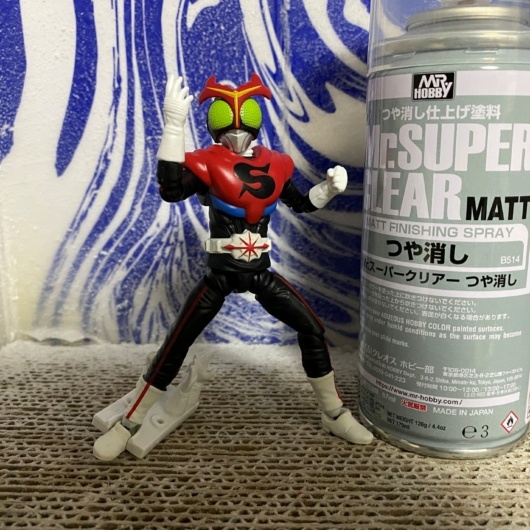 1. つや消しクリアの吹き付け:素組みの状態で、全体に「Mr.スーパークリアつや消し」を吹き付けます。