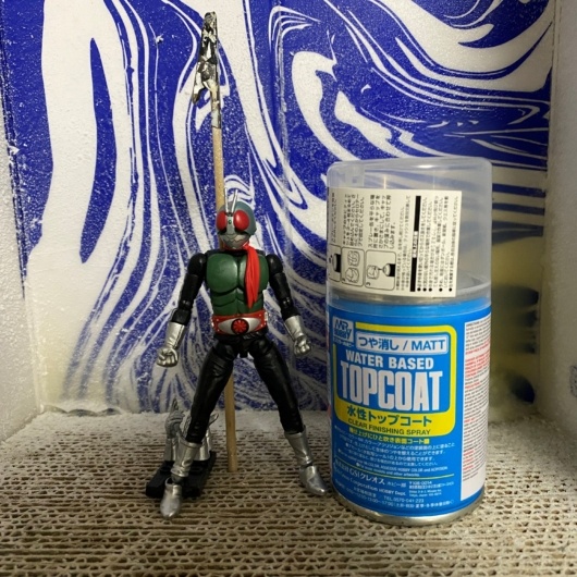 塗装後、水性トップコートつや消しを吹き付けて保護。