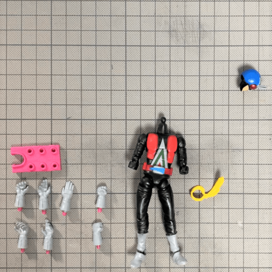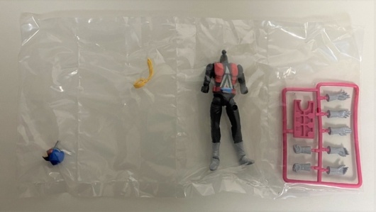 このライダーマンのキットには、彩色済みフィギュア、手の交換パーツ、そして使わない手をディスプレイしつつ、ライダーの台座になるパーツが付属しています。