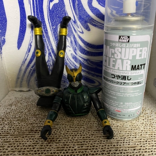 乾燥後、**Mr.スーパークリア(つや消し)**を吹き付けて塗装の下地処理を行いました。