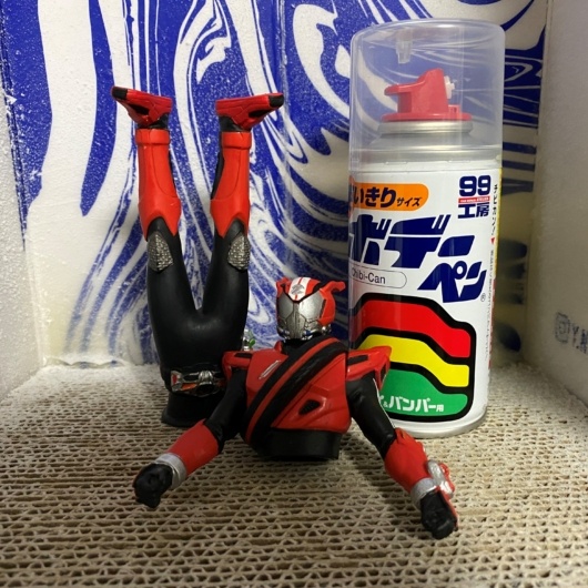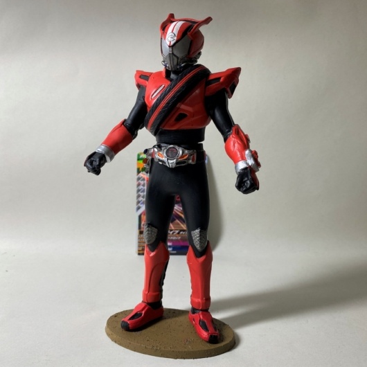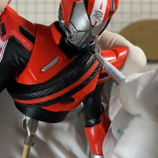 今回は、2014年の仮面ライダードライブ・タイプスピードのソフビフィギュアを、筆塗りによる全塗装でリペイントしました。未塗装の状態から、細部にまでこだわったカラーリングで、まるで別物のように生まれ変わりました。