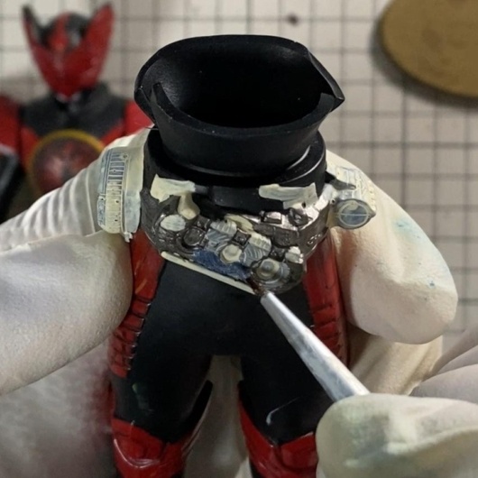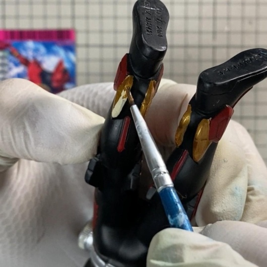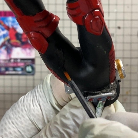 ベルトや肩、脚部などに未塗装や剥離が見られたため、全体を丁寧に再塗装することにしました。