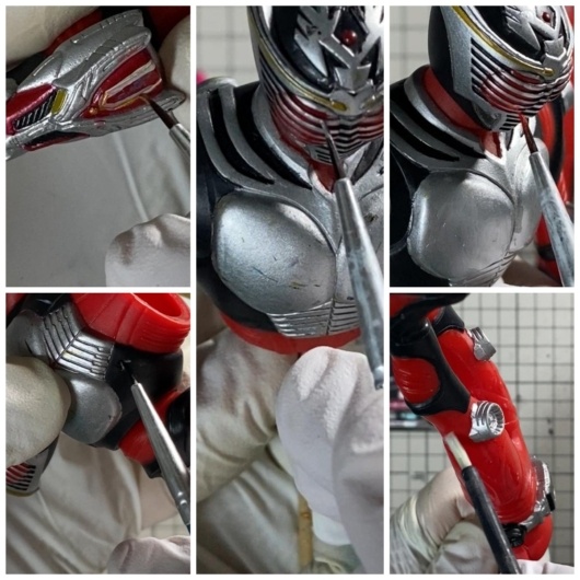 前面の色分けはある程度できていましたが、背面のベルト部などは未塗装。剥離部分の補修を含めてペイントを行いました。